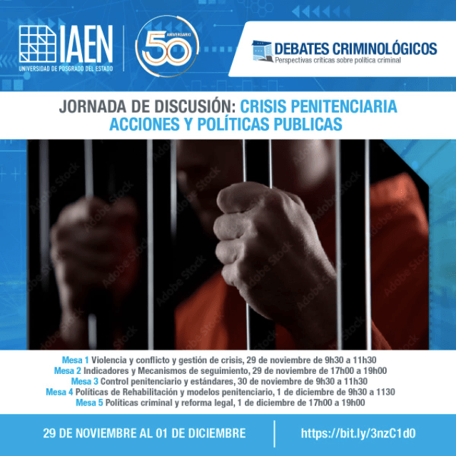 El 29 de noviembre se llevó a cabo la mesa temática sobre Violencia, Conflictos y Gestión de Crisis en la que participó Luis Córdova, coordinador del programa. Esta participación se produjo en el marco de las jornadas de discusión organizadas por el IAEN bajo el título Crisis Penitenciaria, Acciones y Políticas Públicas. Los ejes temáticos del evento fueron: