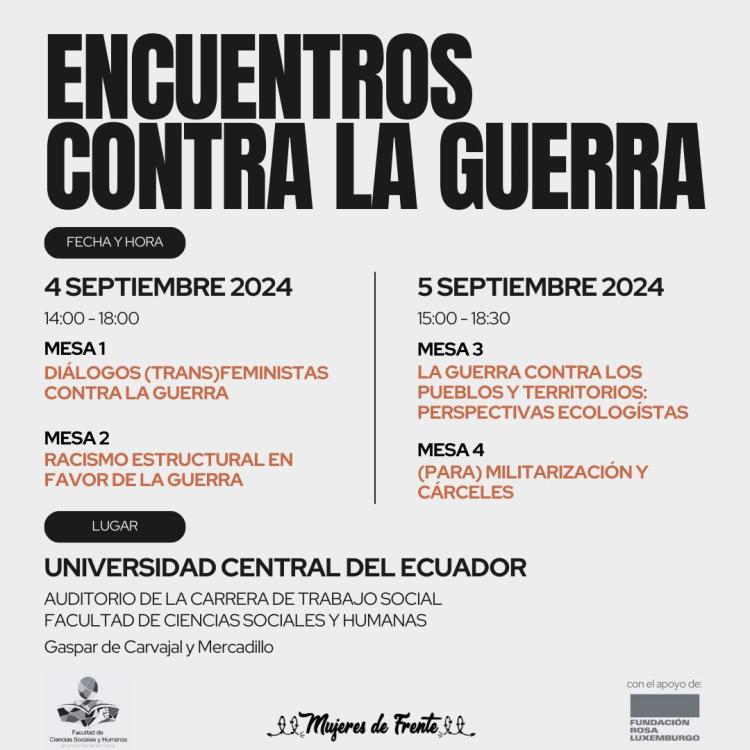 Luis Córdova-Alarcón participó en la Mesa 4 (Para) Militarización y Cárceles el 5 de septiembre del 2024, en el marco de evento denominado «Encuentros contra la Guerra». Los encuentros fueron organizados por Mujeres de Frente, en la Facultad de Ciencias Sociales y Humanas de la Universidad Central del Ecuador.