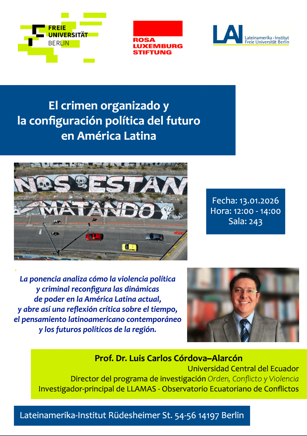 El 13 de enero pasado, en Berlín (Alemania), Luis Córdova-Alarcón presentó la ponencia titulada «La configuración política del futuro: el «timing» del crimen organizado en América Latina» en el Instituto de Estudios Latinoamericanos de la Universidad Libre de Berlín.