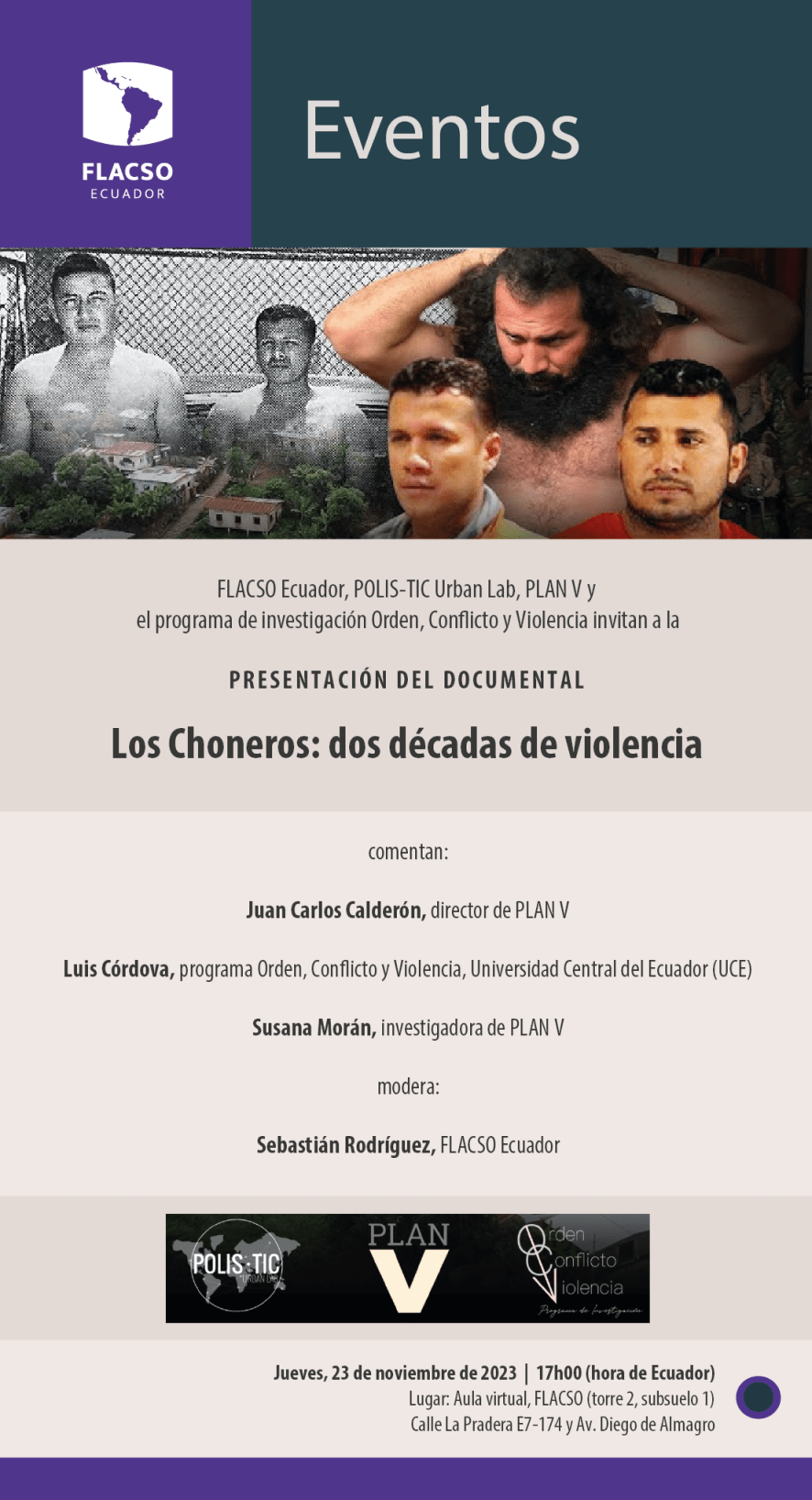 Este jueves 23 de noviembre de 2023 se presentará el documental producido por Revista PlanV, seguido de un conversatorio en el que participarán: Juan Carlos Calderón, director de PLANV Luis Córdova, director del programa de investigación «Orden, Conflicto y Violencia» de la UCE Susana Morán, investigadora de PLANV Sebastián Rodríguez, de FLACSO-Ecuador, actuará como moderador.