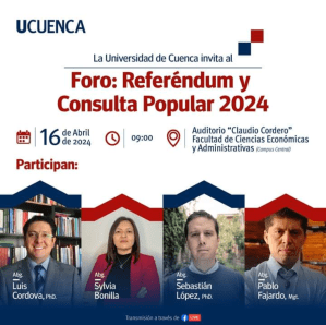 - Foro: Referéndum y Consulta Popular 2024El martes 16 de abril se llevó a cabo el Foro: Referéndum y Consulta Popular 2024, organizado por la Universidad de Cuenca. Participaron como panelistas Luis Córdova, Sylvia Bonilla, Sebastián López y Pablo Fajardo. Moderó Caroline Nieto.