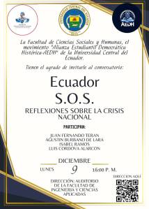 - Ecuador S.O.S. Reflexiones sobre la crisis nacionalLuis Córdova-Alarcón participó como panelista en el conversatorio organizado por la Facultad de Ciencias Sociales y Humanas de la Universidad Central del Ecuador. También participaron Juan Fernando Terán, Agustín Burbarno de Lara e Isabel Robalino.