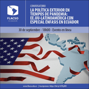 - La política exterior del Ecuador hacia EE.UU. en tiempos de pandemiaEl 30 de septiembre se llevó a cabo el conversatorio titulado «La politica Exterior en tiempos de pandemia: EE.UU. – Latinoamérica con especial énfasis en Ecuador», organizado por el Departamento de Estudios Internacionales de la Facultad Latinoamericana de Ciencias Sociales, FLACSO-Ecuador. En este evento participó Luis Córdova, investigador principal de este programa, con una ponenciaSigue leyendo «La política exterior del Ecuador hacia EE.UU. en tiempos de pandemia»
