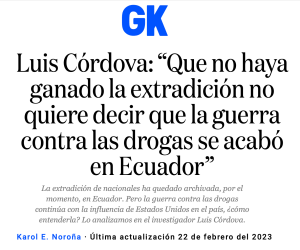 - Análisis sobre la política de seguridad y la relación con EE.UU. [Entrevista para GK]El miércoles 22 de febrero GK publicó la entrevista realizada por Karol Noroña a Luis Córdova. En ella se aborda un amplio análisis sobre el escenarios post-elecciones del 5 de febrero, sobre la política de seguridad del gobierno de Guillermo Lasso y, en especial, sobre la relación con EE.UU. y su papel en la «guerraSigue leyendo «Análisis sobre la política de seguridad y la relación con EE.UU. [Entrevista para GK]»
