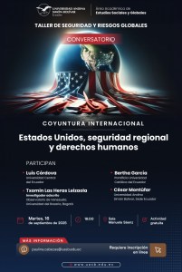- Estados Unidos, seguridad regional y derechos humanosEl pasado martes 16 de septiembre, Luis Córdova participó en el panel organizado por el Taller de Seguridad y Riesgos Globales, del Área Académica de Estudios Sociales Y globales de la Universidad Andina Simón Bolívar. En el evento también participaron como panelistas Txomin Las Heras Leizaola y Bertha García. Cómo moderador intervino César Montúfar.