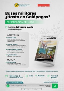 - Bases militares ¿Hasta en Galápagos?Presentación del libro: «La mirada imperial puesta en Galápagos». Mira y escucha la transmisión en vivo del evento: https://www.facebook.com/UASBAmbiente